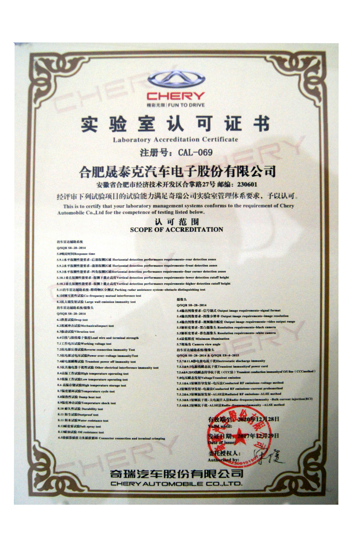 實驗室認(rèn)可證書 奇瑞汽車股份有限公司
