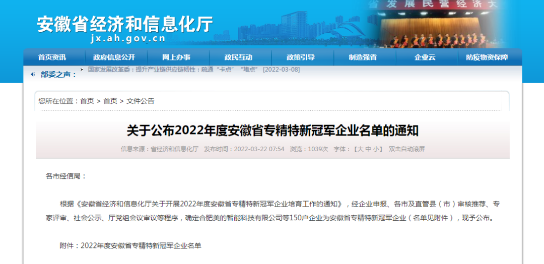 日前,安徽省經(jīng)信廳發(fā)布了《關(guān)于公布2022年度安徽省專精特新冠軍企業(yè)名單的通知》,我司憑借雄厚的技術(shù)實力和創(chuàng)新能力成功入選該名單。
