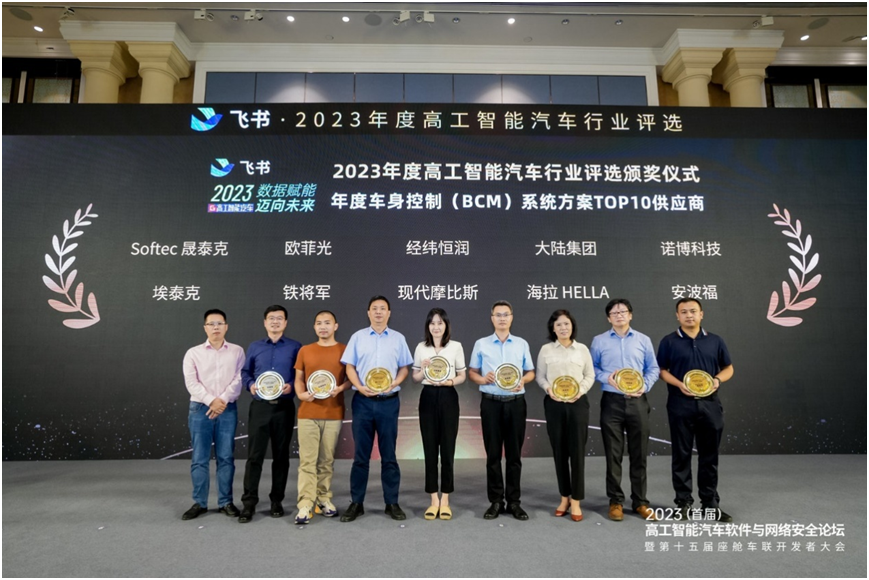 8月30-31日,2023(首屆)高工智能汽車軟件與網(wǎng)絡(luò)安全峰會暨第十五屆座艙車聯(lián)開發(fā)者大會在上海隆重舉行。在同期舉辦的“2023年度智能汽車軟件·網(wǎng)絡(luò)安全·座艙車聯(lián)競爭力評選”活動中,合肥晟泰克憑借過硬技術(shù)實力和產(chǎn)品創(chuàng)新能力,榮獲“年度車身控制(BCM)系統(tǒng)方案TOP10供應(yīng)商”。本獎項基于專家評審、前裝量產(chǎn)數(shù)據(jù)和業(yè)界好評度等多項指標(biāo)綜合評定,標(biāo)志著晟泰克產(chǎn)品持續(xù)獲得客戶認可并領(lǐng)跑行業(yè)。