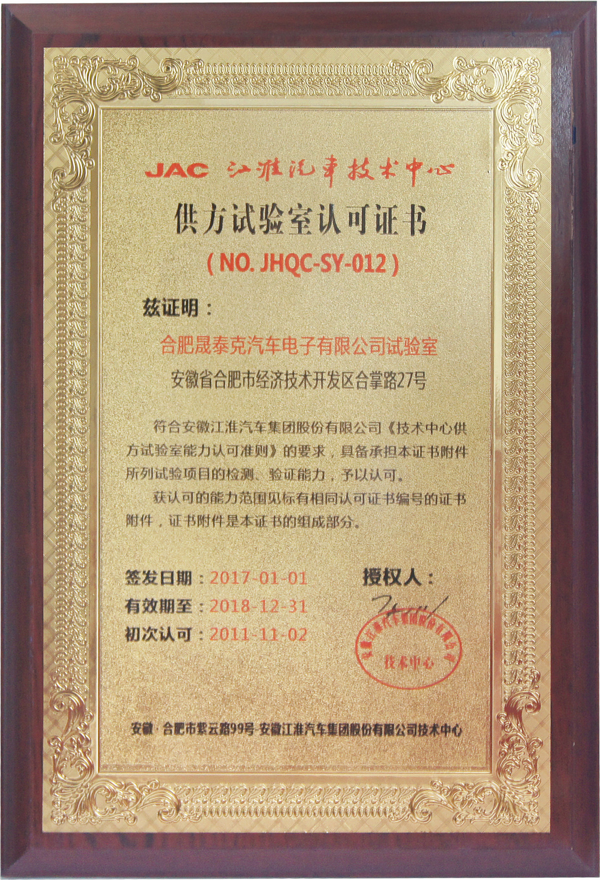 江淮汽車技術(shù)中心供方實驗室認(rèn)可證書