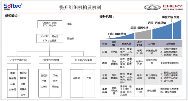 近年來,隨著日趨競爭激烈的汽車行業(yè)急速發(fā)展,主機廠想要求生存、謀發(fā)展,就必須依靠過硬的產(chǎn)品質(zhì)量和高質(zhì)量的服務(wù)來搶占市場,贏得客戶的認可。奇瑞公司本著以“促進供應商系統(tǒng)改進,不斷提升過程保證能力,提高市場競爭力”為目的,開展2020年度供應商“一廠一策”培育活動,合肥晟泰克作為奇瑞核心戰(zhàn)略供應商,成立了以奇瑞先期供應商質(zhì)量部劉(波)部長和合肥晟泰克許(永華)總經(jīng)理為組長的能力提升機構(gòu),匯集了雙方質(zhì)量、技術(shù)、采購的小組成員,制定了年度工作計劃及目標,明確了提升方向。